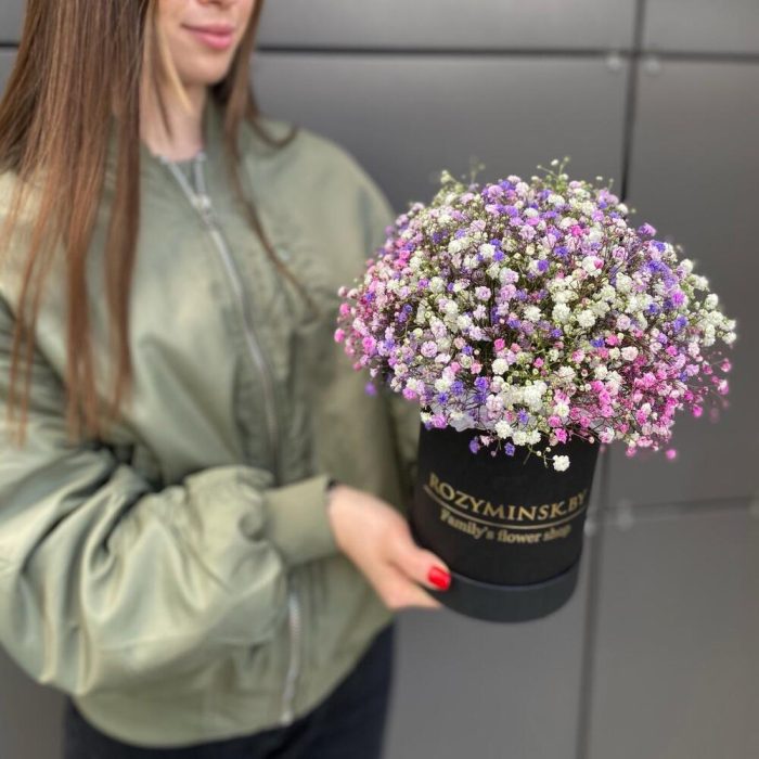 “Сиреневый туман” – композиция из гипсофилы в шляпной коробке