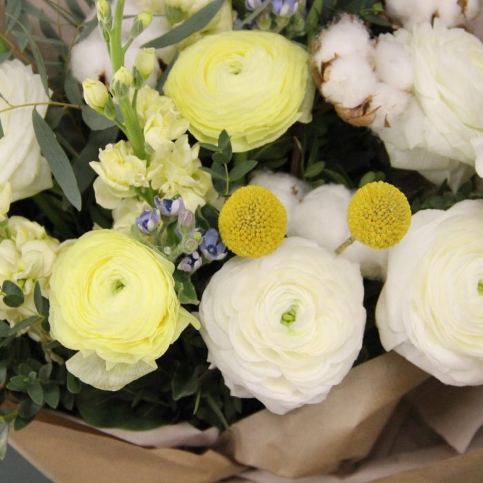 Ранункулюс – 6 шт.Маттиола – 5 шт.Твидия – 4 шт.Хлопок – 3 шт.Амарант – 2 шт.Краспедия – 2 шт.Эвкалипт – 7 шт.Упаковка – 3 шт.Лента атласная – 1 шт.