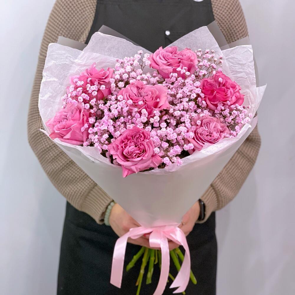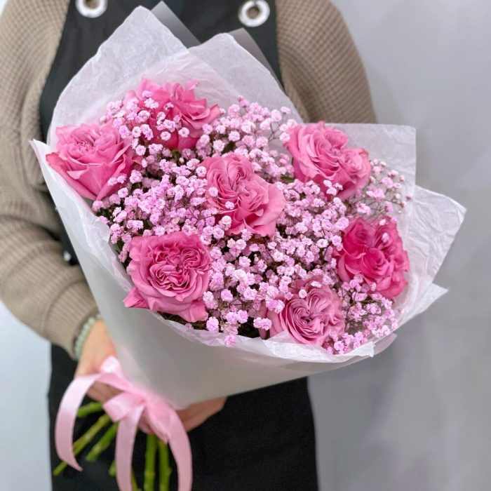 пионовидные розы кантри блю – 7 шт.розовая гипсофила – 2 шт.Упаковка дизайнерская – 1 шт.