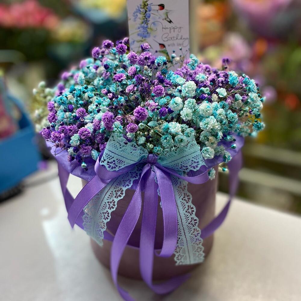 “Сиреневый туман” – композиция из гипсофилы в шляпной коробке