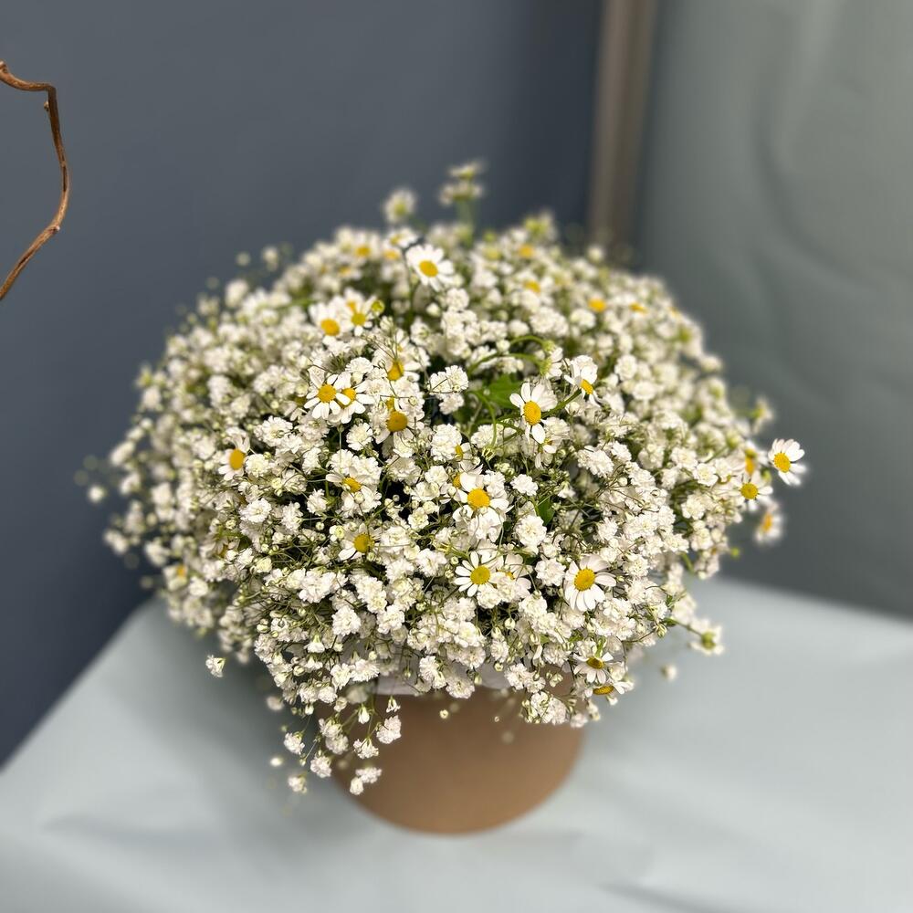 Матрикария – 3 шт.Гипсофила – 5 шт.Коробка шляпная – 1 шт.Оазис флористический – 1 шт.Тишью – 1 шт.