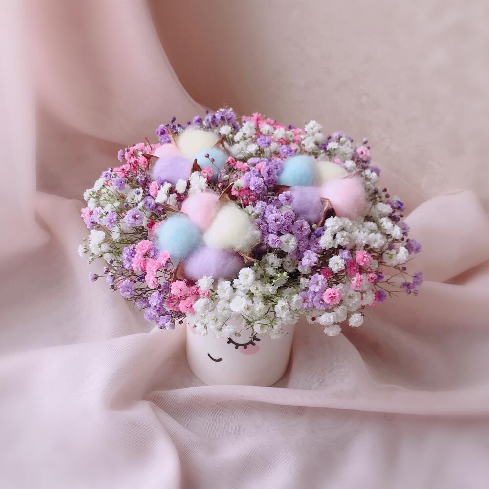 Флористическая губка – 1 шт.Кашпо керамика – 1 шт.Инструкция по уходу – 1 шт.гипсофила радужная – 3 шт.хлопок радужный – 3 шт.