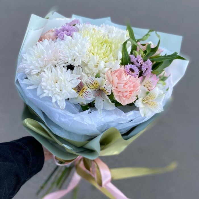 Альстромерия – 4 шт.Хризантема кустовая – 2 шт.Лента атласная – 5 шт.Диантус – 4 шт.Сантини – 3 шт.Упаковка дизайнерская – 7 шт.магнум белый – 1 шт.