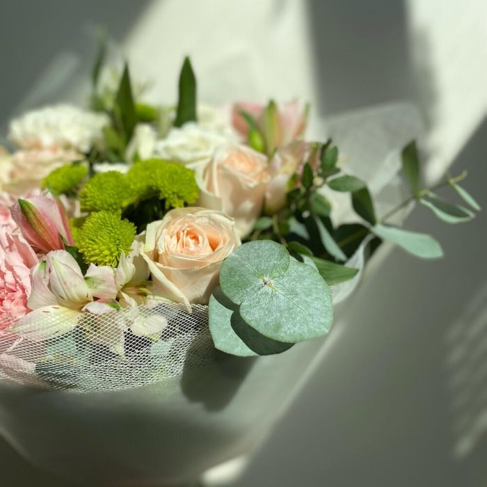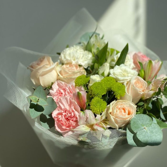 Альстромерия – 3 шт.Роза – 4 шт.Зелень – 5 шт.Упаковка – 7 шт.Гвоздика – 5 шт.Сантини – 1 шт.Фисташка – 6 шт.