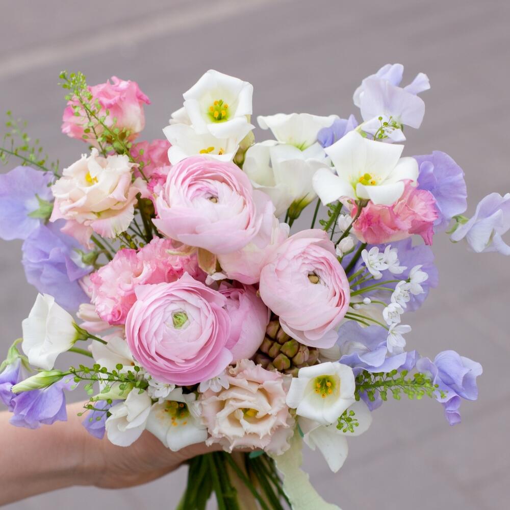 Нежный букет с латирусом и ранункулюсами в корейском стиле