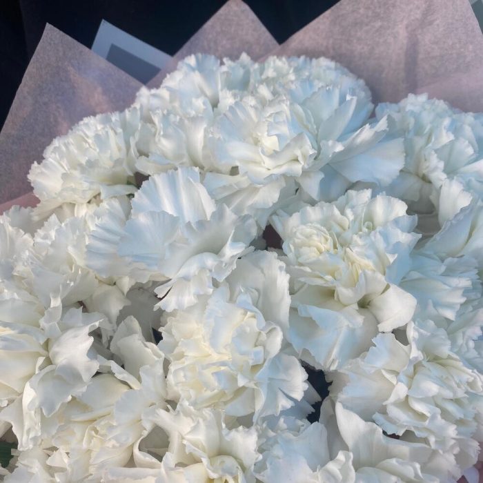 Упаковка дизайнерская – 3 шт.Тишью белое – 2 шт.гвоздика белая сортовая – 19 шт.