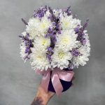 Коробка d12 – 1 шт.Оазис – 1 шт.Хризантема кустовая – 5 шт.Гипсофила фиолетовая – 2 шт.Пшеница (сухоцвет) – 9 шт.