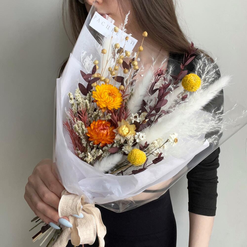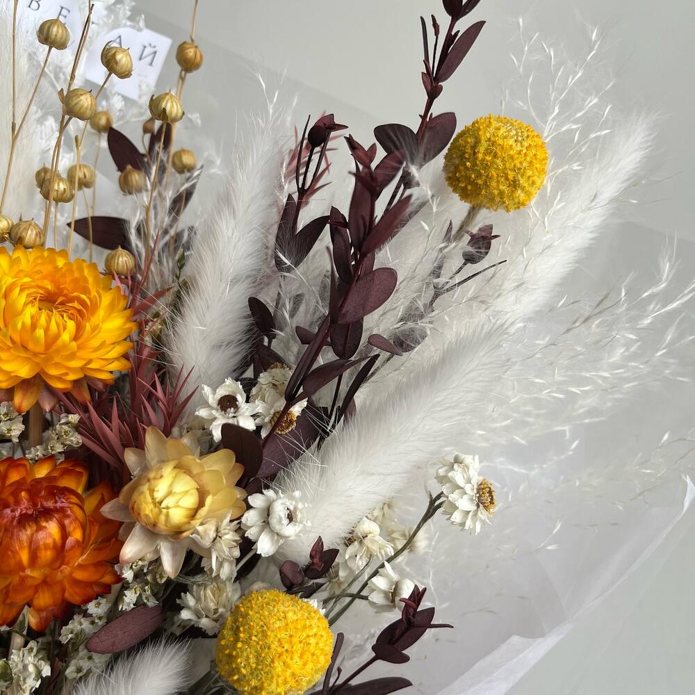 Упаковка дизайнерская – 1 шт.Гелихризум – 3 шт.Краспедия – 2 шт.аммобиум – 1 шт.Лагурус – 7 шт.Лен – 1 шт.Эвкалипт – 1 шт.пампасная трава – 1 шт.
