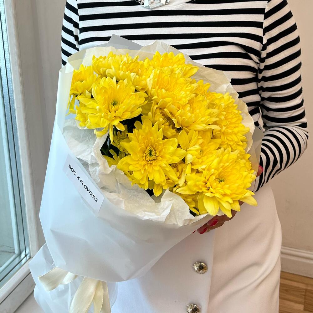 Хризантема кустовая – 3 шт.Лента атласная – 1 шт.Дизайнерская упаковка – 1 шт.