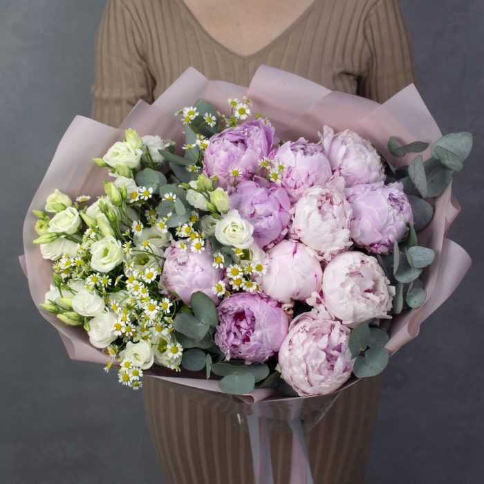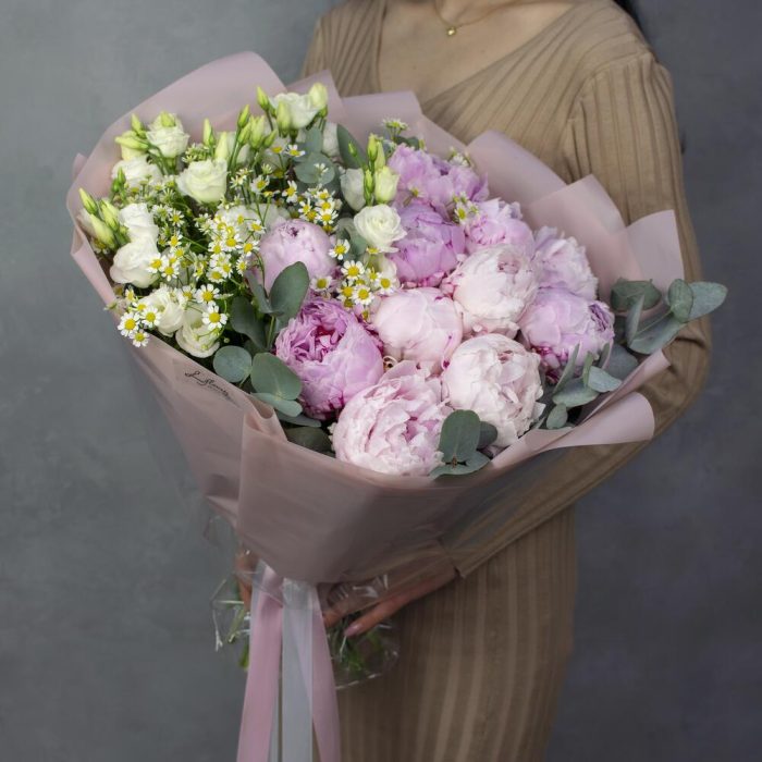 Матрикария – 7 шт.Лизиантус белый – 5 шт.Эвкалипт цинерея – 3 шт.пионы сара бернардт – 11 шт.