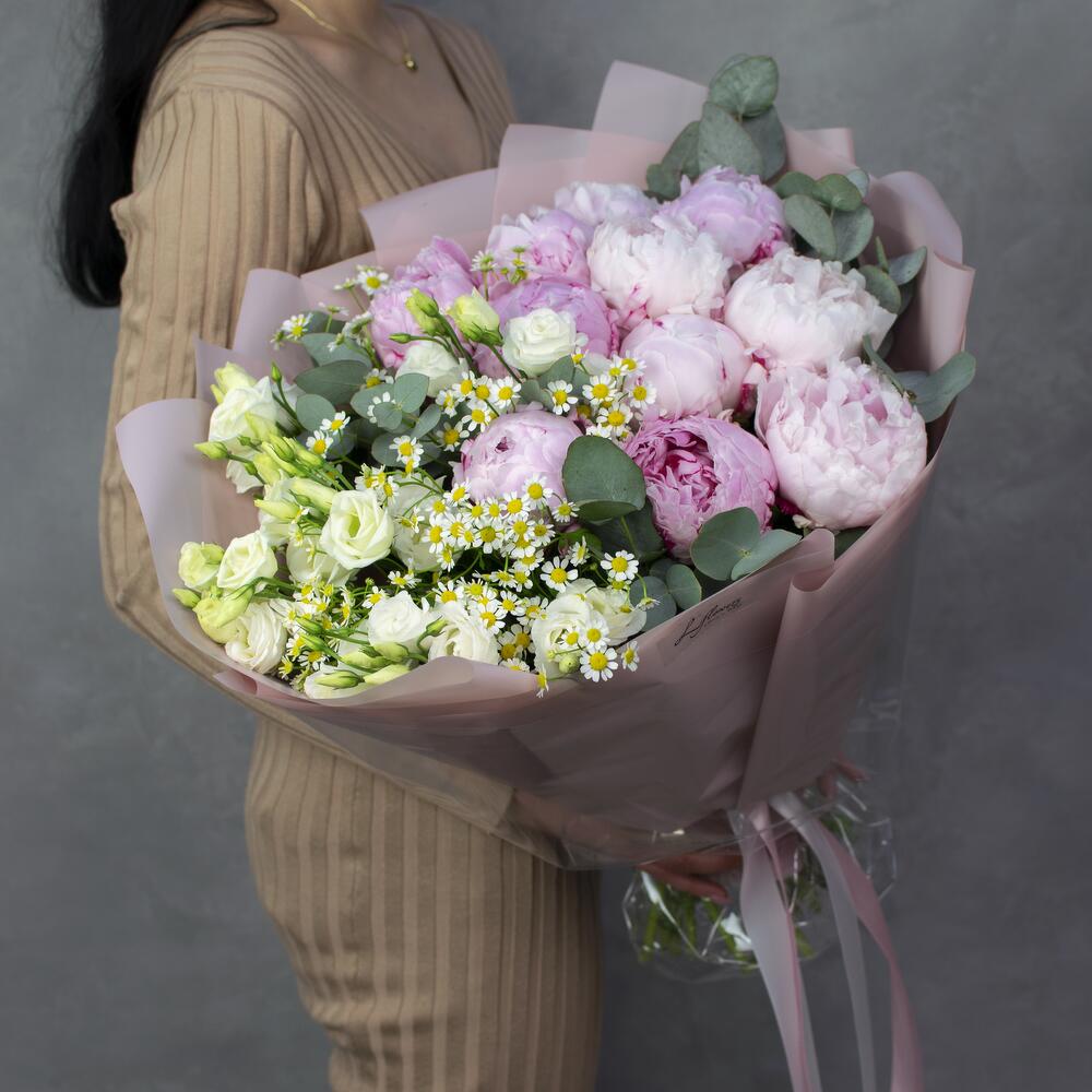 Летний микс с розовыми пионами, лизиантусами и ромашкой.