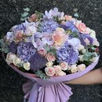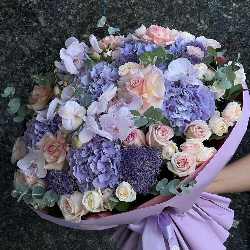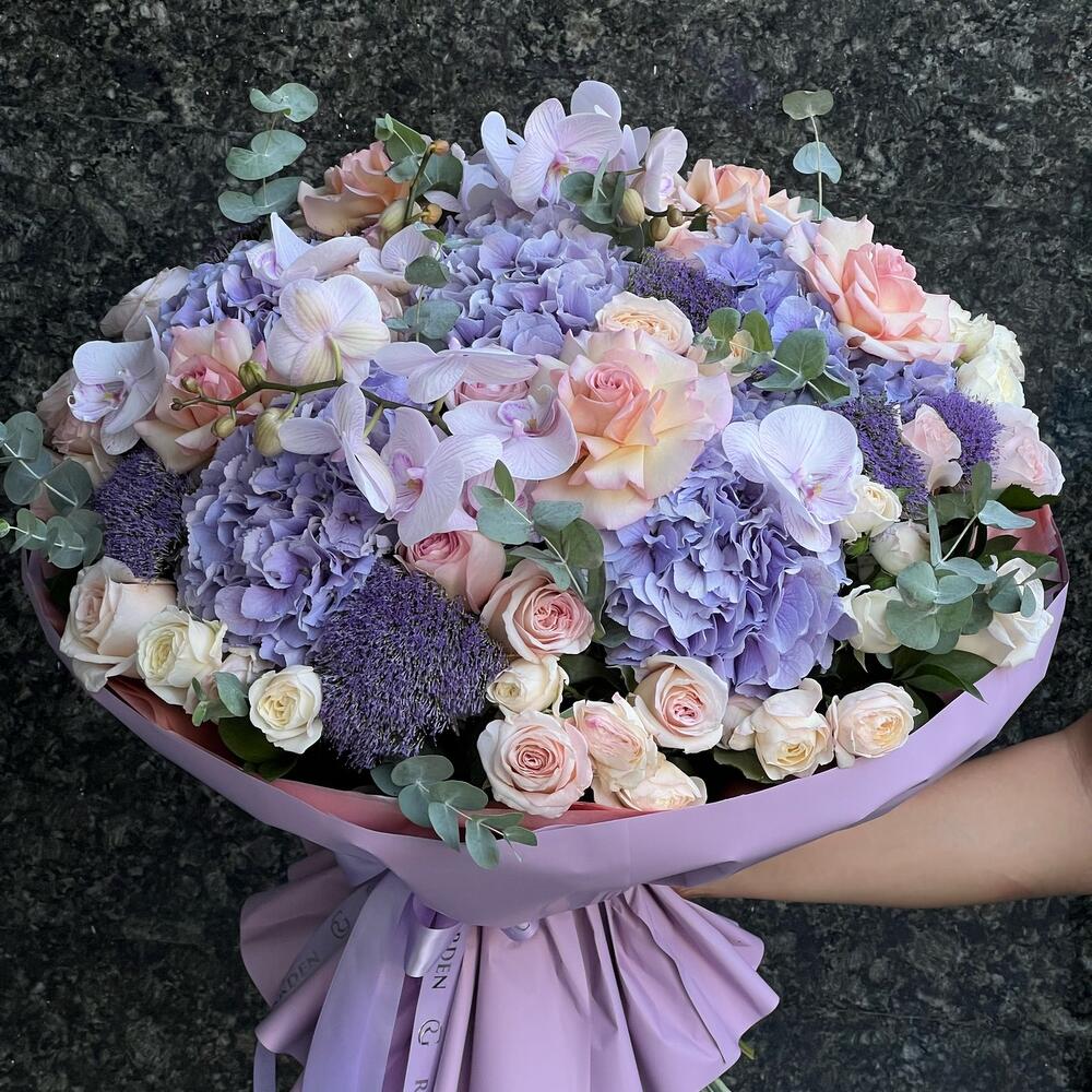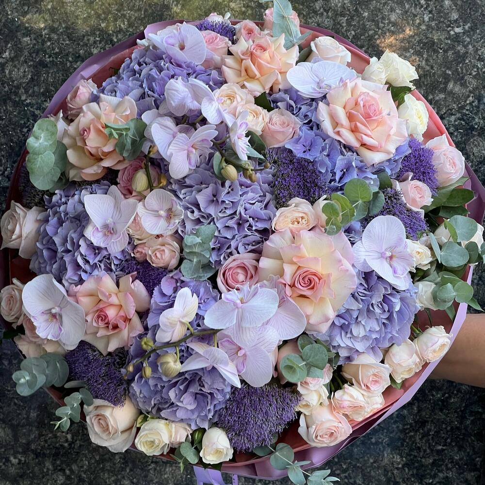 гортензии сиреневые – 6 шт. Орхидея Фаленопсис ветка – 2 шт. розы – 35 шт. Эвкалипт – 4 шт. Трахелиум – 9 шт. пионовидные спрей розы – 15 шт.
