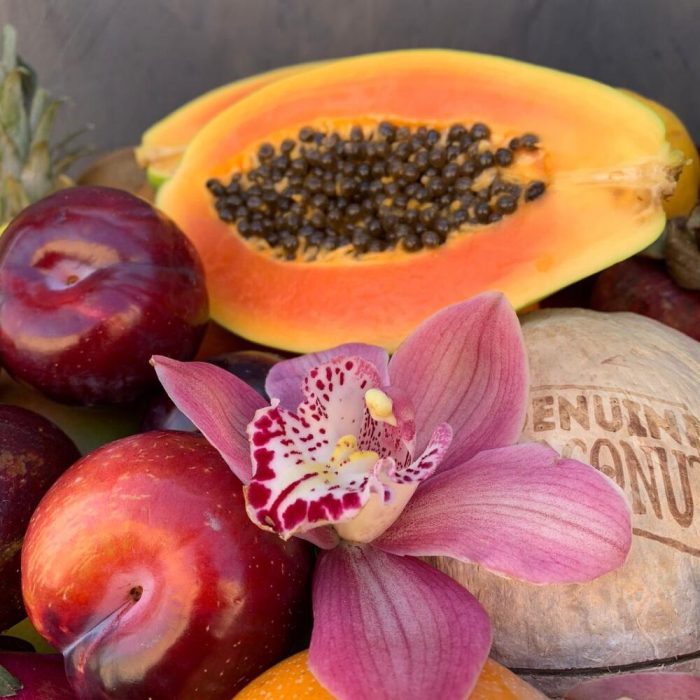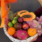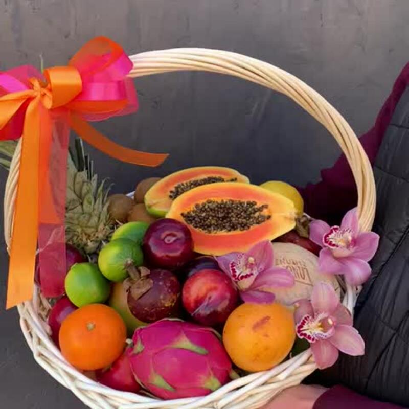 Корзина плетеная – 1 шт.Ананас – 1 шт.Папайя – 1 шт.Кокос – 1 шт.манго – 1 шт.Драгон фрукт – 1 шт.мангостан – 2 шт.Гуава – 2 шт.киви 500 гр – 1 шт.яблоки 1000гр – 1 шт.мандарины 800 гр – 1 шт.Лайм – 3 шт.Лимон – 1 шт.Слива красная – 5 шт.Орхидея Цимбидиум – 3 шт.Лента атласная – 3 шт.