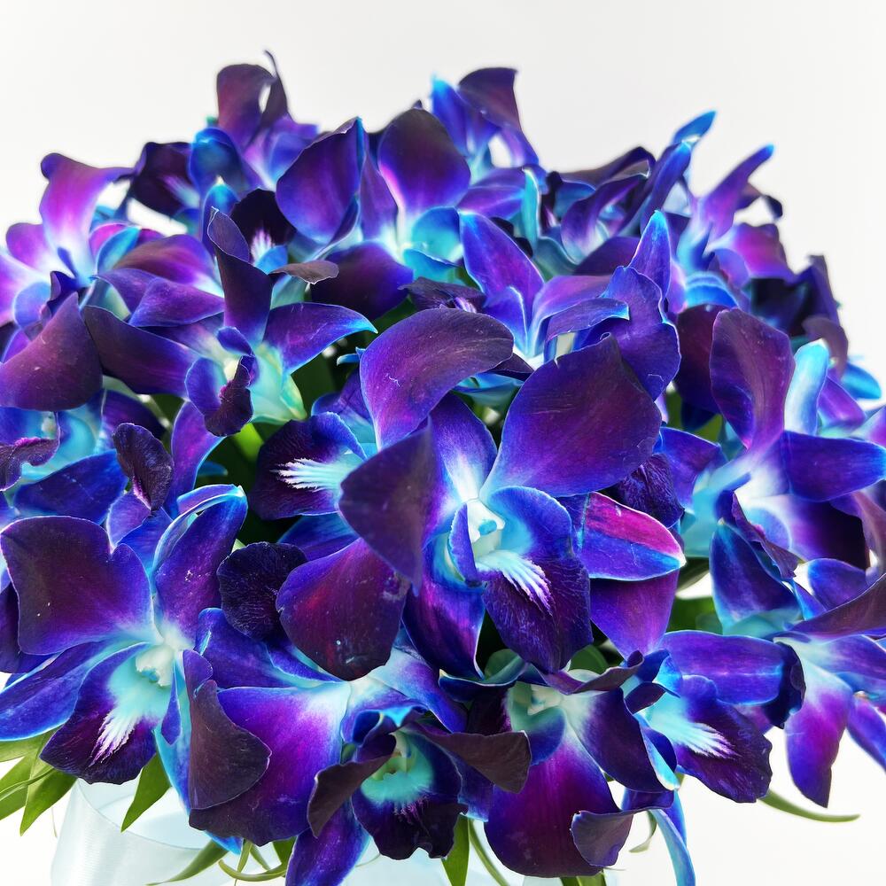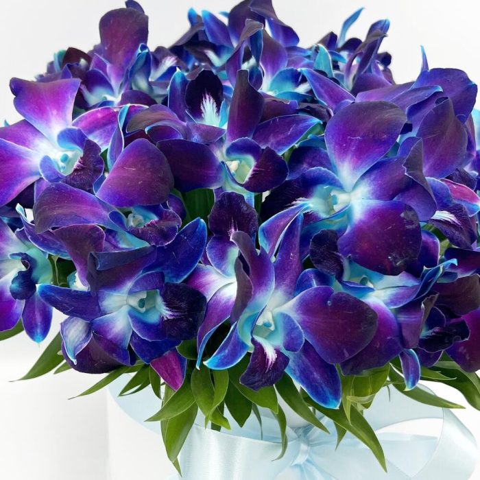 орхидея дендробиум синяя бутоны – 51 шт.удлинитель для орхидеи – 25 шт.Шляпная коробка – 1 шт.Губка флористическая – 1 шт.любовь флориста (бесплатно) – 1 шт.инструкция по уходу за цветами – 1 шт.Средство для продления жизни цветов – 1 шт.Зелень – 1 шт.