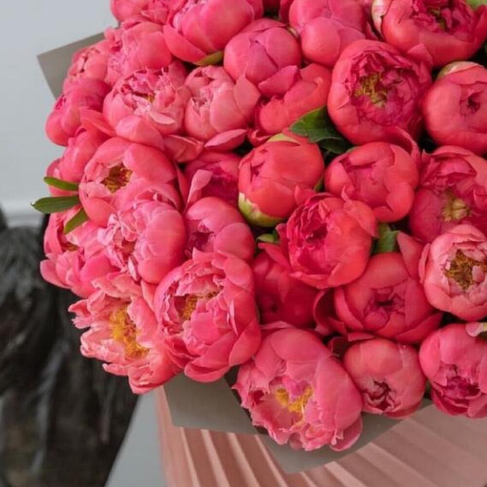 Пион розовый – 51 шт.Упаковка дизайнерская – 2 шт.Лента атласная – 2 шт.Открыточка с вашими пожеланиями – 1 шт.хорошее настроение – 100 шт.инструкция по уходу за цветами – 1 шт.коробка переноска – 1 шт.Кризал – 1 шт.