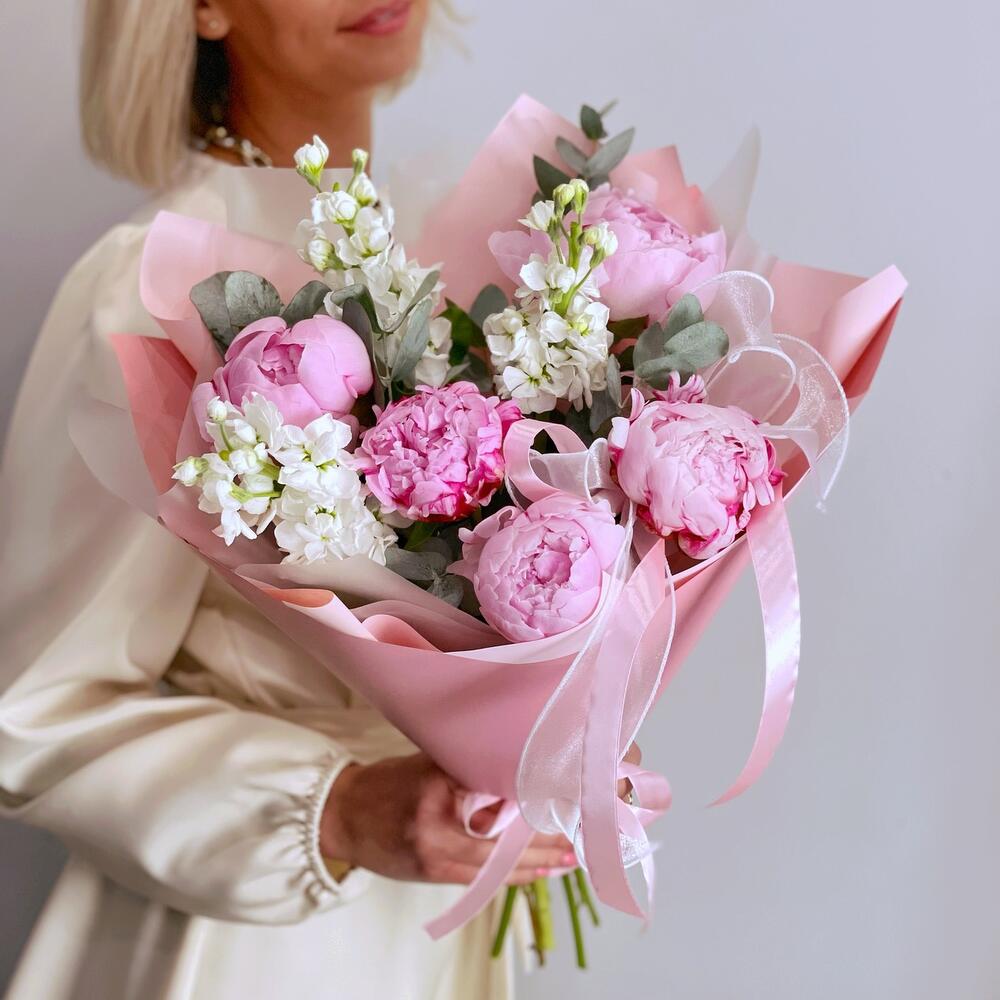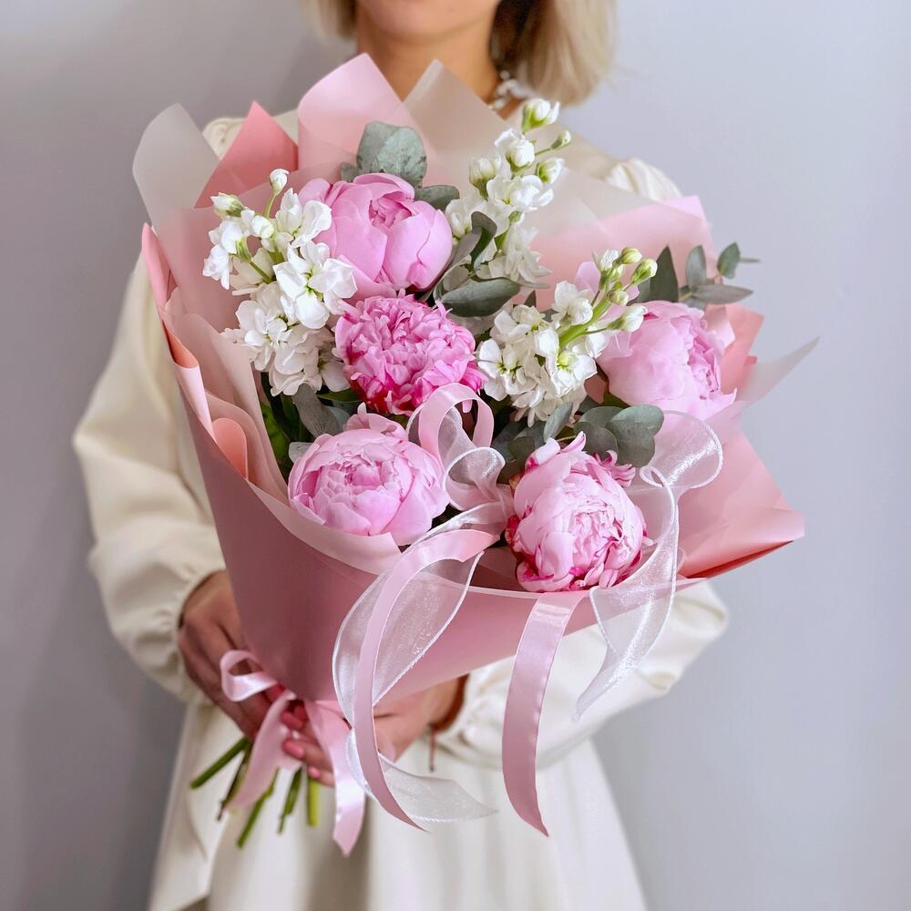 розовые пионы сара бернар – 5 шт.белая маттиола – 3 шт.Эвкалипт – 1 шт.Упаковка дизайнерская – 1 шт.