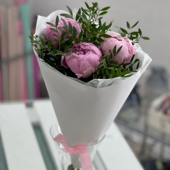 Упаковка – 2 шт.Лента атласная – 1 шт.Фисташка – 2 шт.Открытка – 1 шт.Пион Сара Бернар – 3 шт.Кризал (подкормка) – 1 шт.