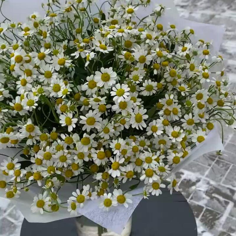 Лента атласная – 2 шт.Упаковка дизайнерская – 3 шт.матрикария ромашка кустовая – 15 шт.