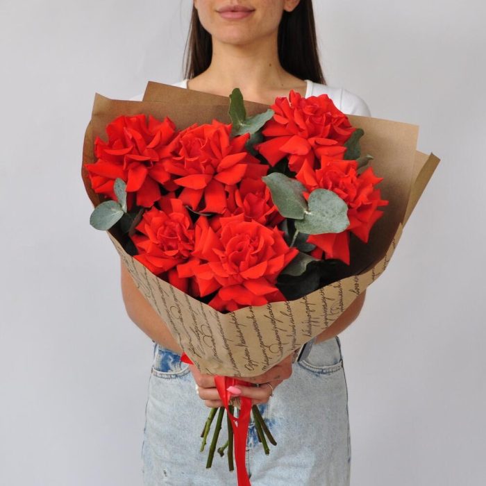 Эвкалипт – 1 шт.Лента атласная – 1 шт.Крафт – 3 шт.Роза французская – 7 шт.