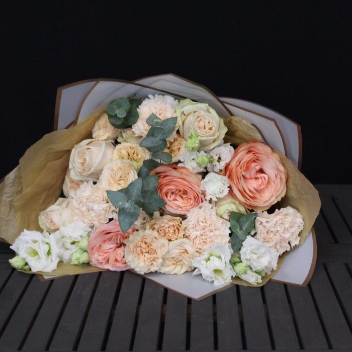 роза вайт о хара( ароматная) – 5 шт.трендсеттер роза кустовая – 2 шт.Роза кахала пионовидная – 3 шт.эустома алиса вайт – 3 шт.Диантус – 4 шт.Эвкалипт – 2 шт.Тишью – 2 шт.Пленка матовая – 3 шт.Лента атласная – 2 шт.