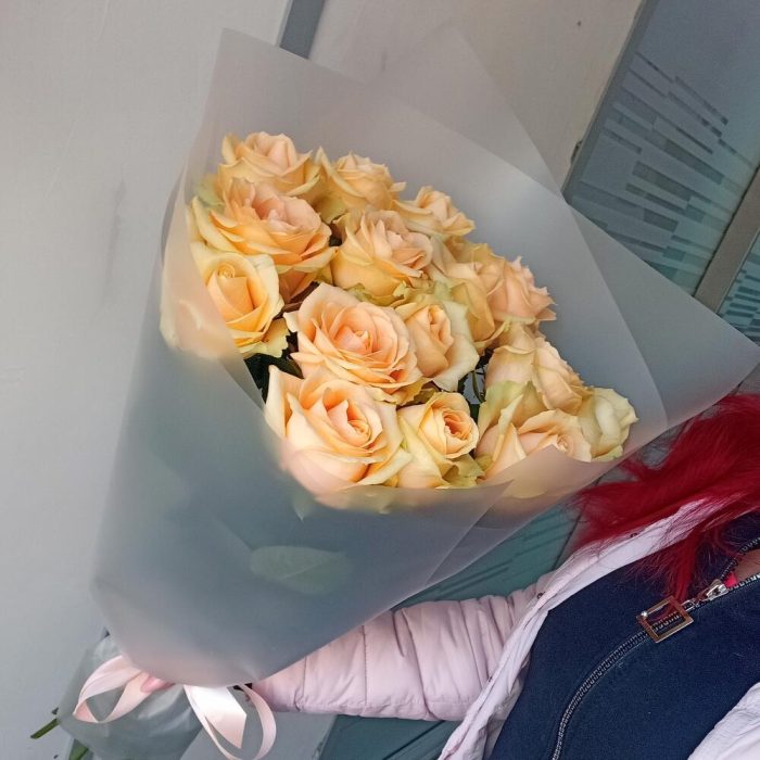 Лента атласная – 1 шт.Упаковка дизайнерская – 3 шт.роза пич аваланж 60 см – 15 шт.