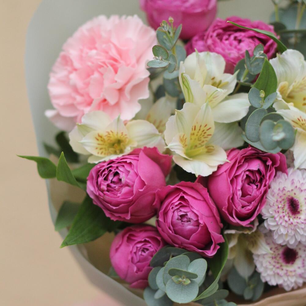 Роза пионовидная кустовая – 2 шт. Альстромерия – 2 шт. Диантус розовый – 2 шт. Хризантема Сантини – 1 шт. Эвкалипт Гунни – 3 шт.