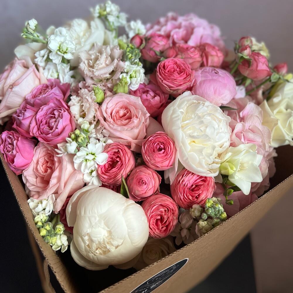 Гортензия – 2 шт.Пионовидная кустовая роза – 3 шт.Лизиантус (эустома) – 2 шт.Пион – 5 шт.Пионовидная одноголовая роза – 3 шт.Одноголовая роза – 3 шт.Фрезия – 3 шт.Маттиола – 6 шт.Кустовая роза – 2 шт.Атласная лента – 2 шт.