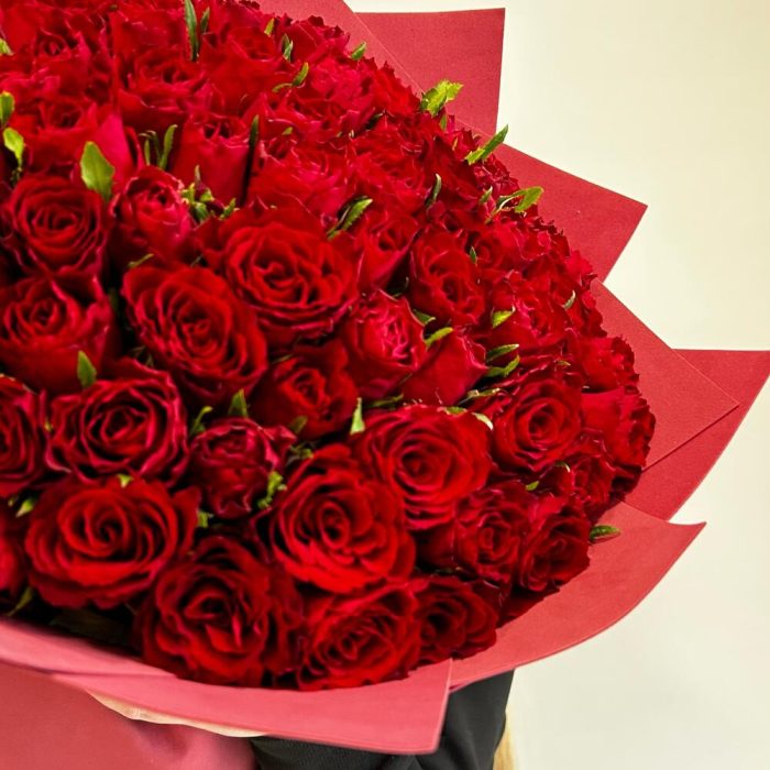 Роза – 101 шт.Лента атласная – 5 шт.Упаковка дизайнерская – 5 шт.