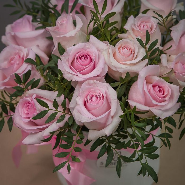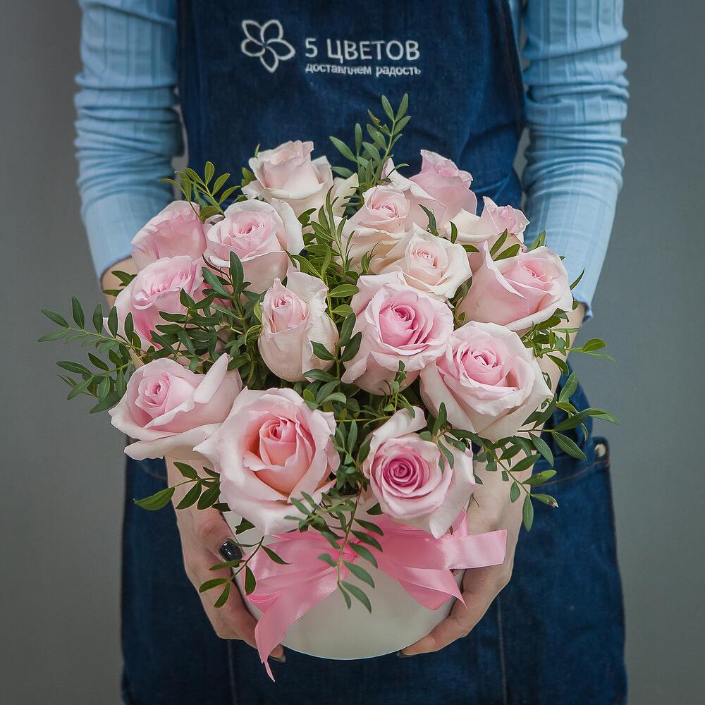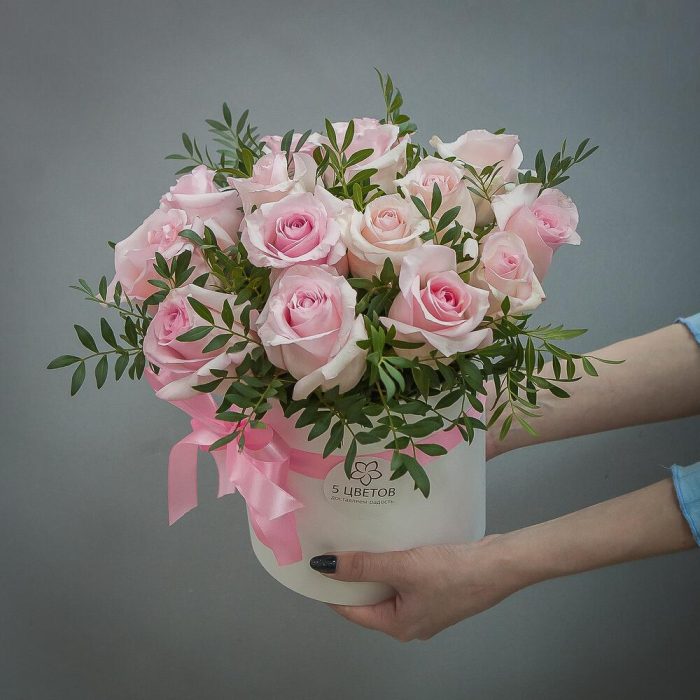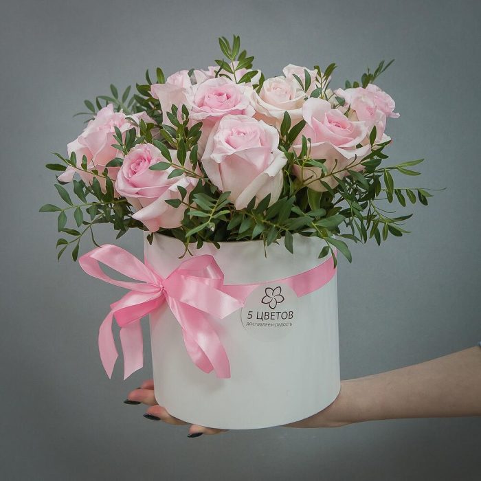 Роза розовая – 15 шт.Шляпная коробка – 1 шт.