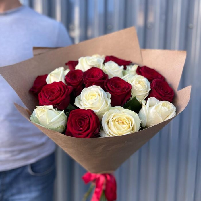 Роза красная 60 см – 11 шт.Крафт упаковка – 1 шт.Роза белая 60 см – 10 шт.