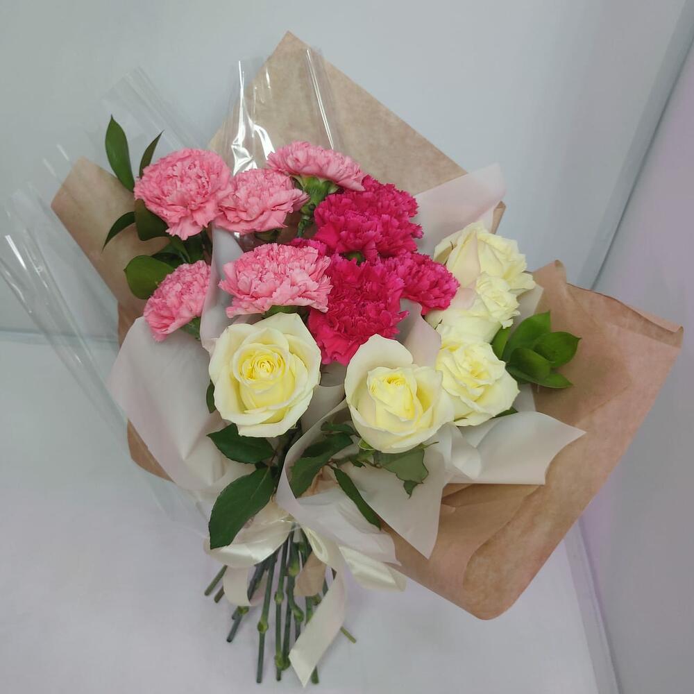 роза кения 40 см – 5 шт.диантусы микс – 10 шт.Рускус – 2 шт.Дизайнерская упаковка – 1 шт.