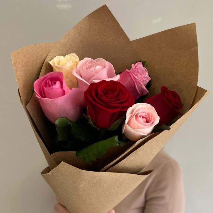 Букет из 7 разноцветных роз в упаковке