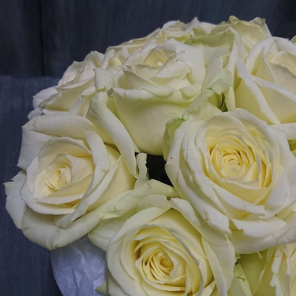 Букет из белых роз в шляпной коробке “Светлые чувства”