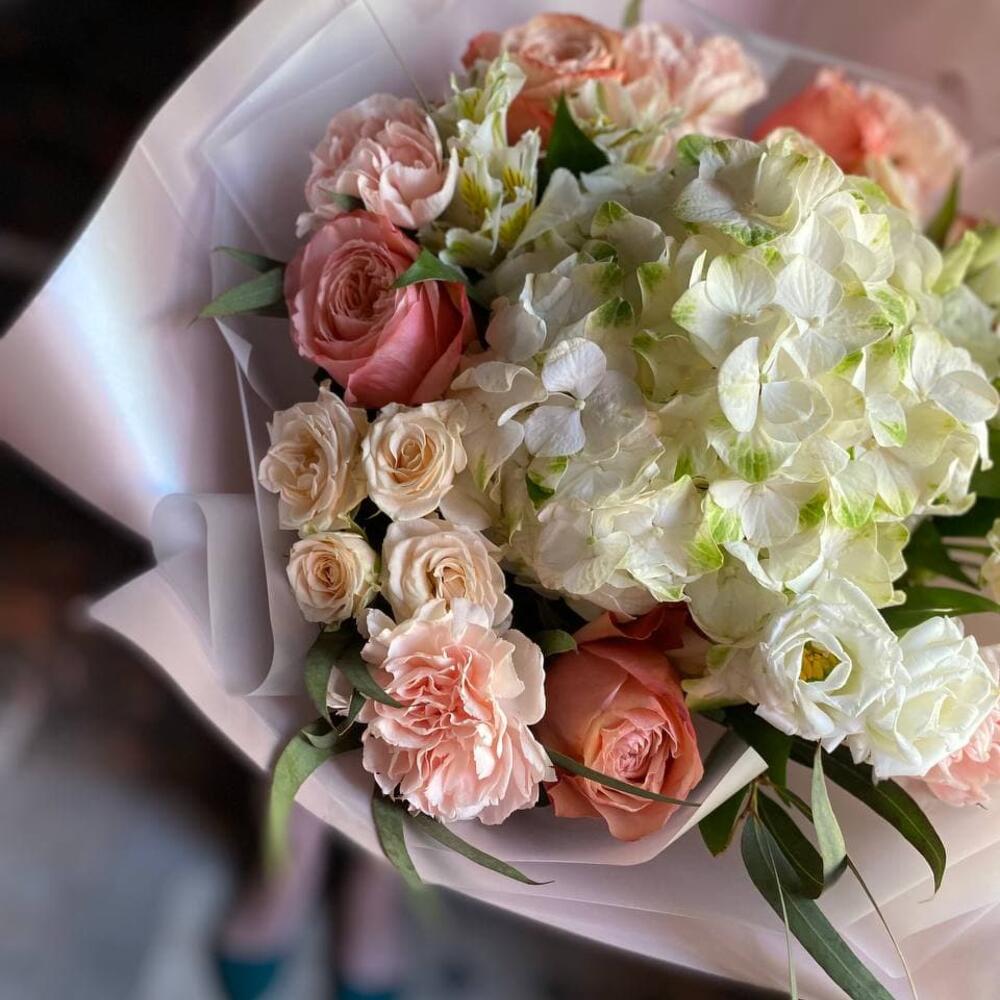 Гортензия – 1 шт.Роза пионовидная – 5 шт.Гвоздика – 5 шт.Альстромерия – 2 шт.Роза кустовая – 3 шт.Эустома – 2 шт.Эвкалипт – 2 шт.Упаковка – 2 шт.