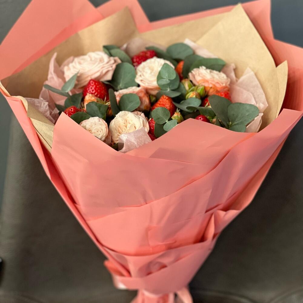Клубника – 10 шт.Роза кустовая – 7 шт.Лента атласная – 1 шт.Упаковка дизайнерская – 2 шт.эвкалипт мини – 9 шт.