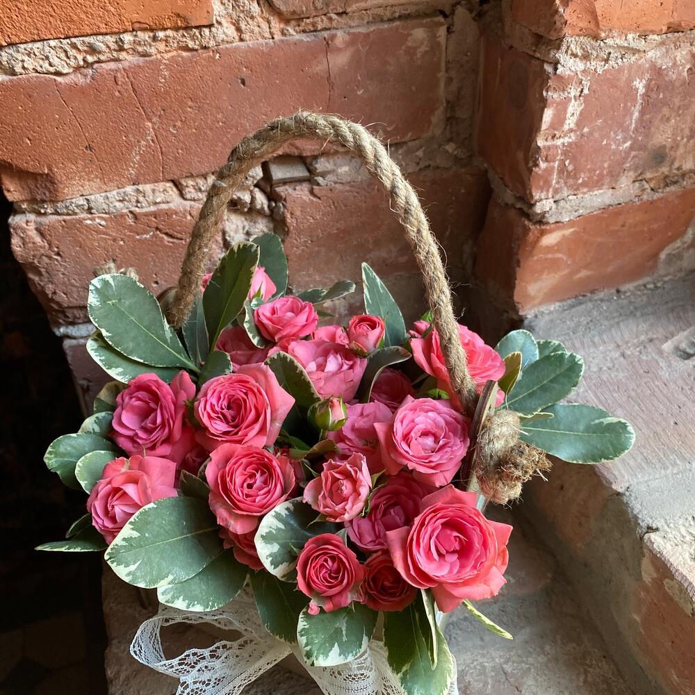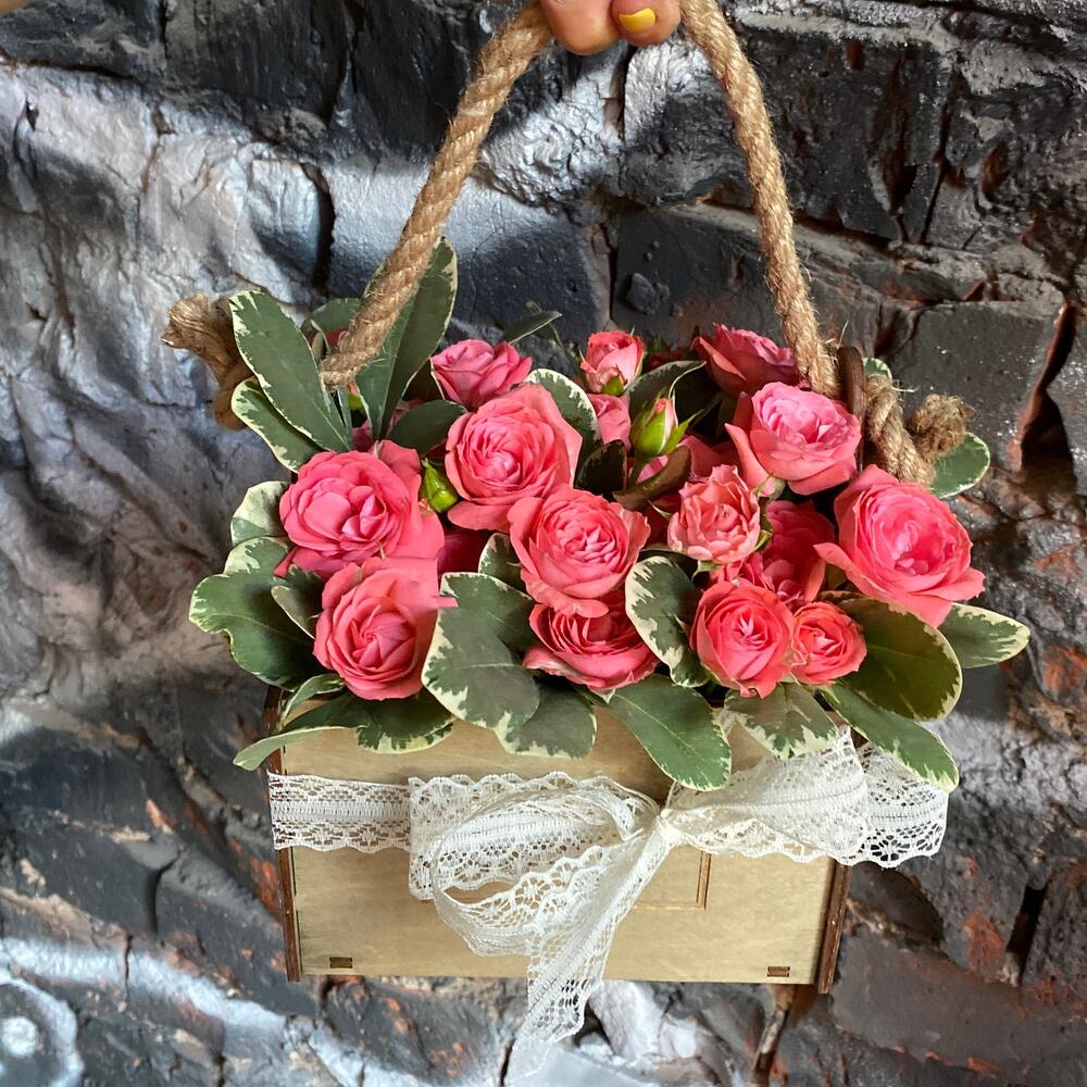Роза кустовая – 7 шт.Питтоспорум – 3 шт.Ящик деревянный – 1 шт.Оазис флористический – 1 шт.Лента – 1 шт.