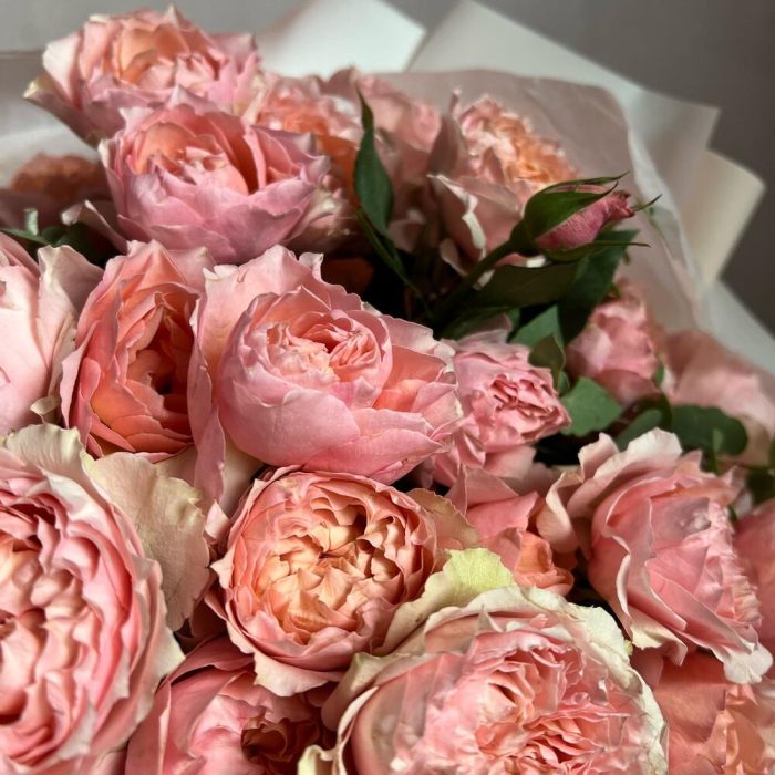 Букет из моно пионовидной кустовой розы Джульетта и эвкалипт