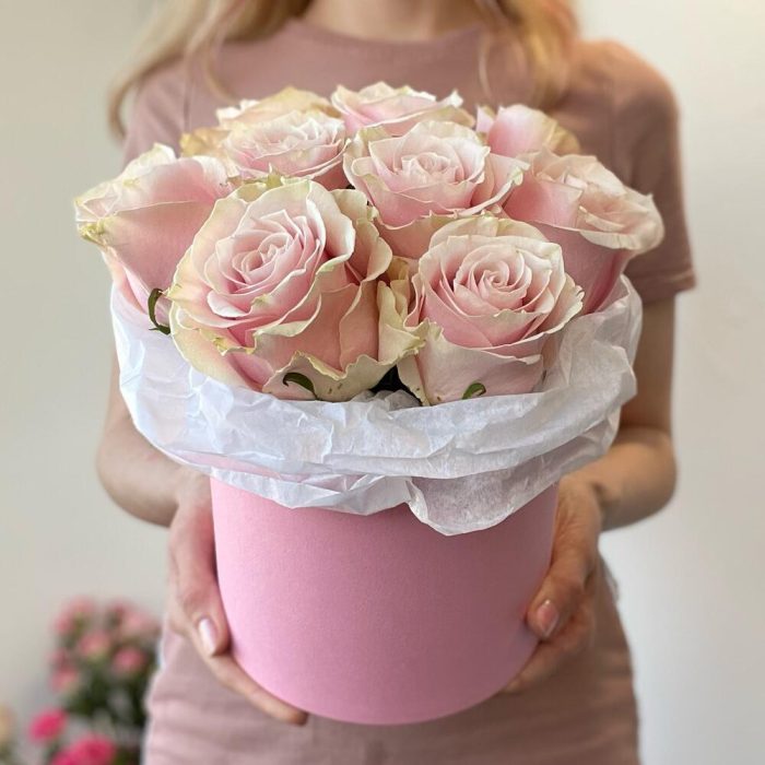 Розовая роза – 9 шт.Шляпная коробка с лентами – 1 шт.