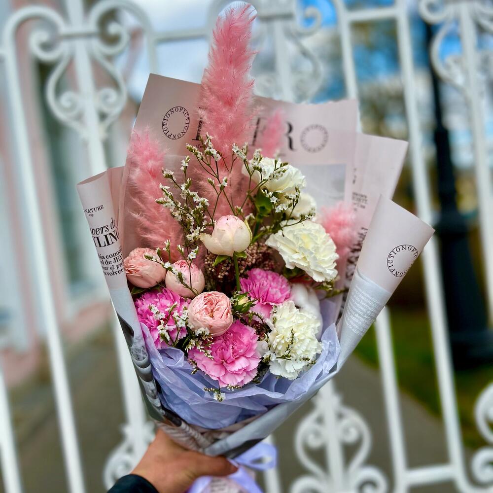 Озотамнус – 1 шт.Роза кустовая – 1 шт.Гвоздика – 7 шт.Лагурус – 1 шт.Лимонуим – 1 шт.Дизайнерская упаковка – 1 шт.