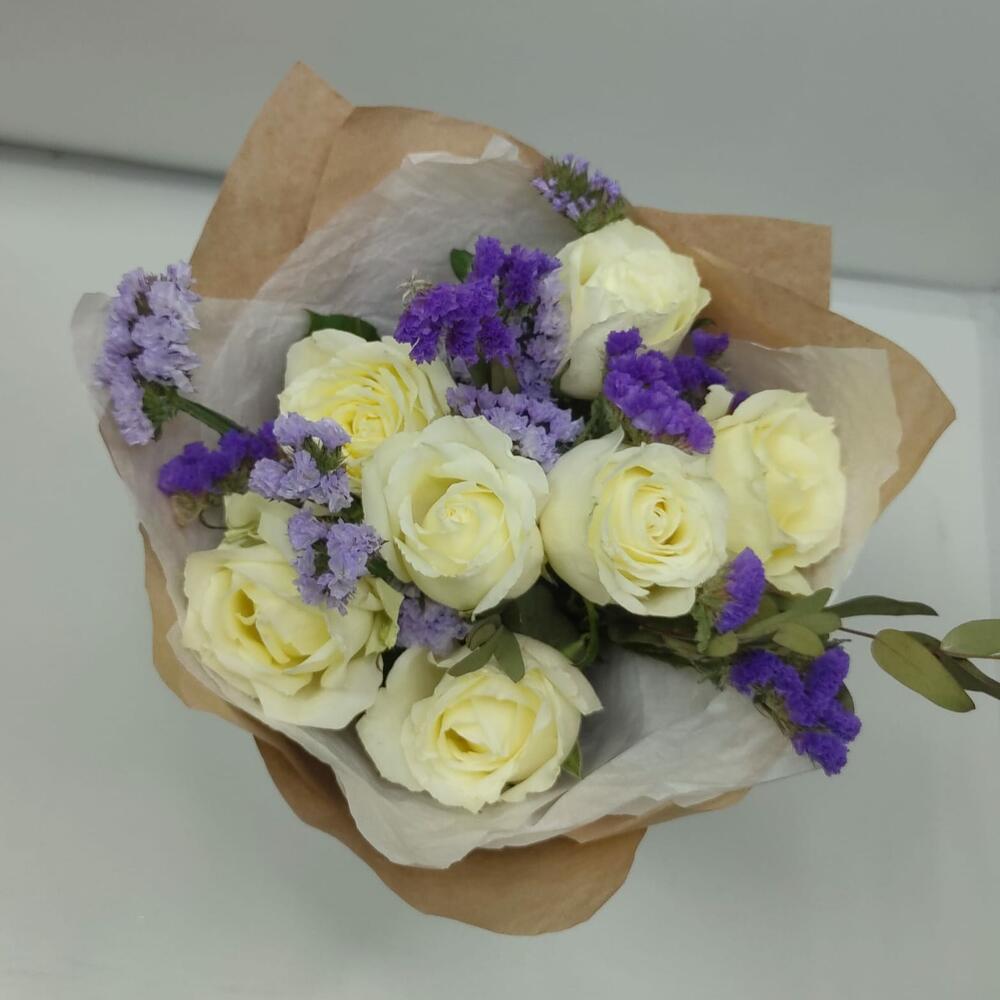 роза кения – 7 шт.Статица – 2 шт.Эвкалипт – 1 шт.Дизайнерская упаковка – 1 шт.