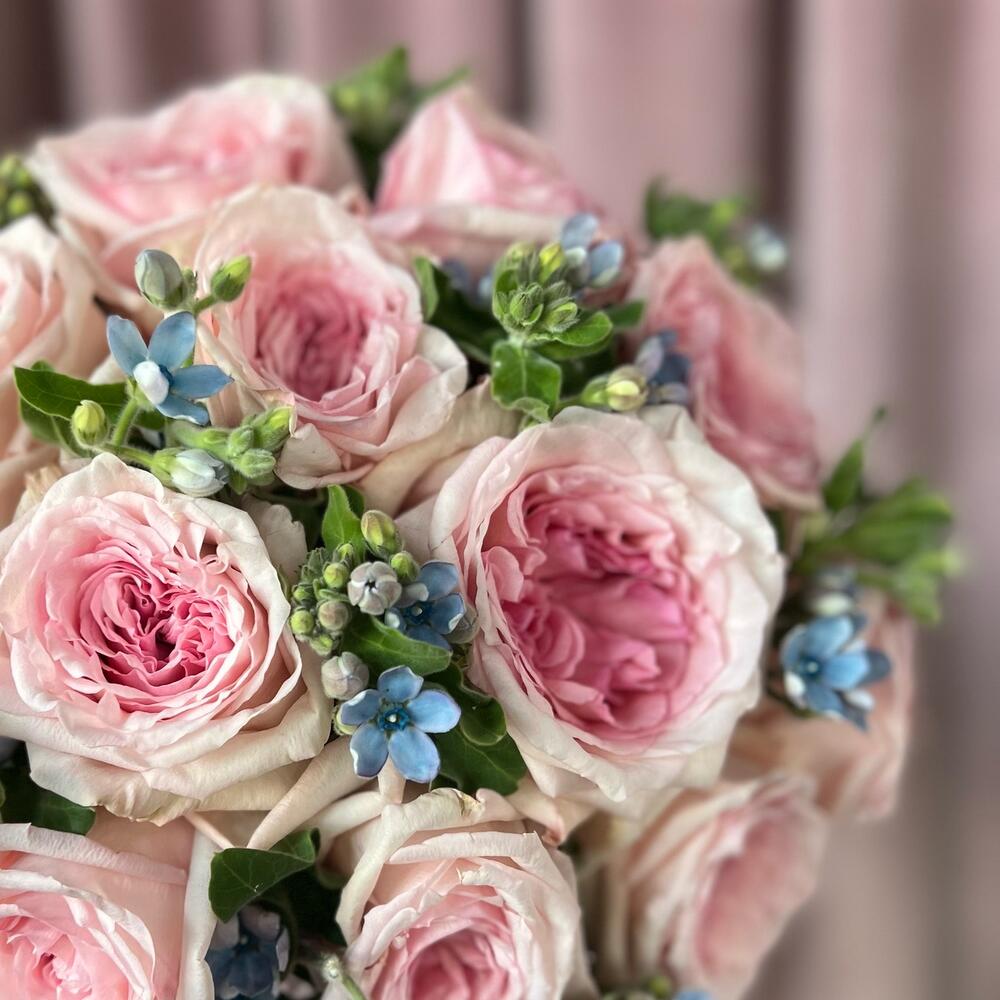 Пионовидная роза – 11 шт.Атласная лента – 1 шт.Оксипеталум – 9 шт.