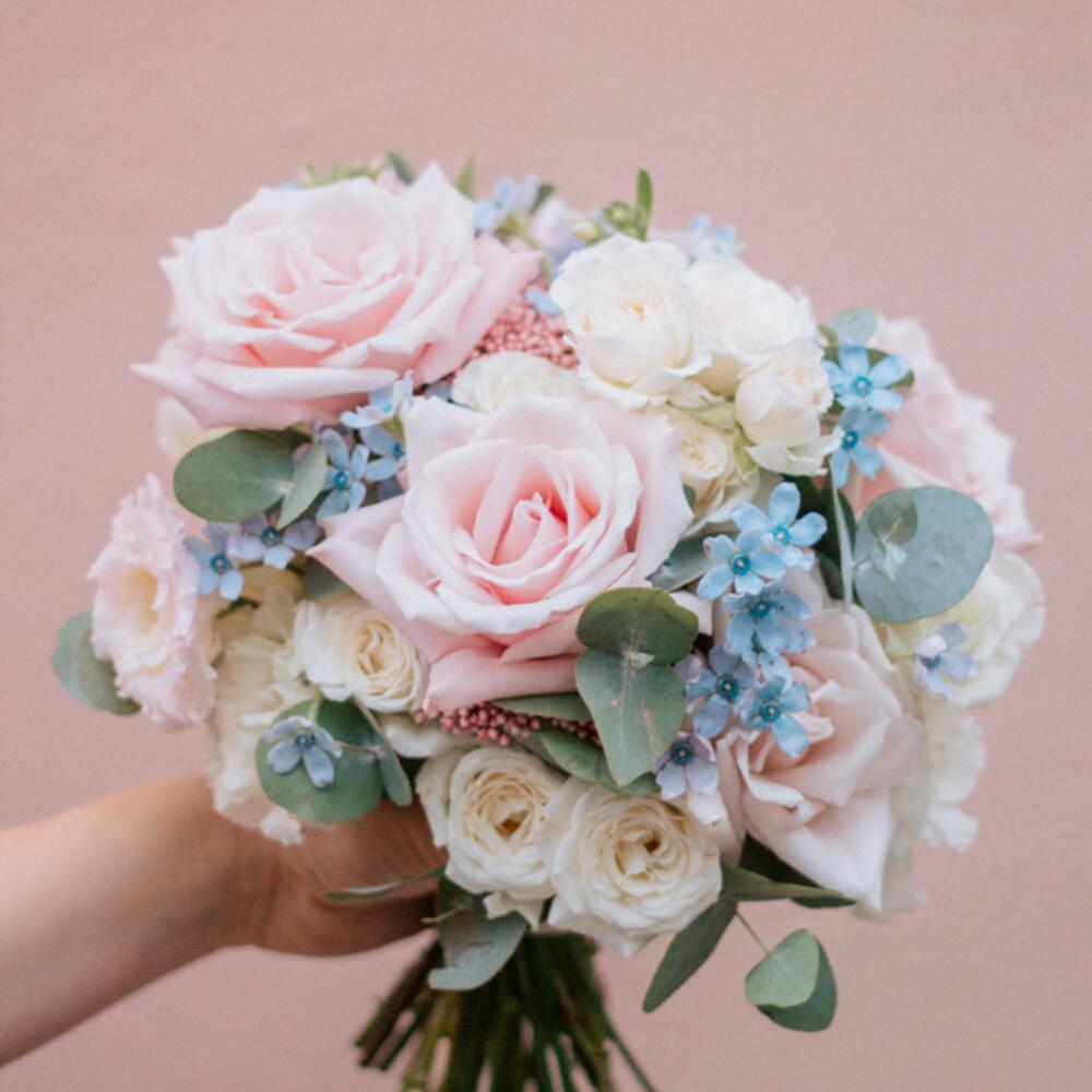 Оксипеталум – 6 шт.Роза – 5 шт.Кустовая роза – 4 шт.Эвкалипт – 4 шт.Озотамнус – 2 шт.