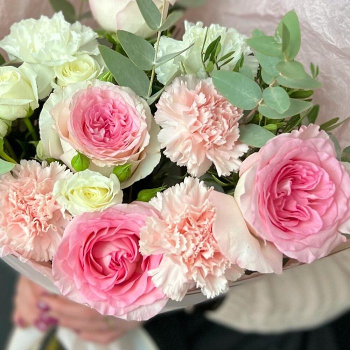 Роза кустовая – 1 шт.Эвкалипт – 1 шт.Роза Эквадор – 5 шт.Гвоздика – 5 шт.Упаковка дизайнерская – 1 шт.