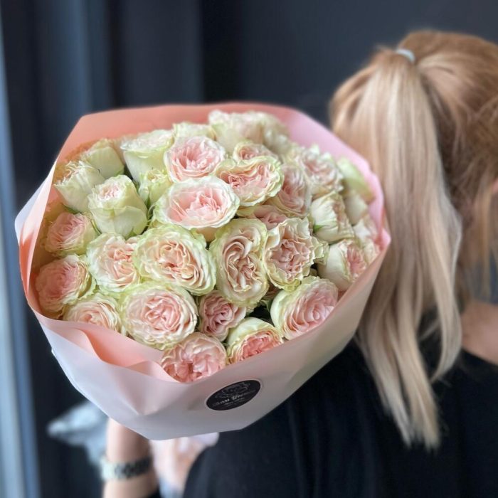 Кустовая пионовидная роза – 15 шт.Дизайнерская упаковка – 1 шт.Лента атласная – 1 шт.
