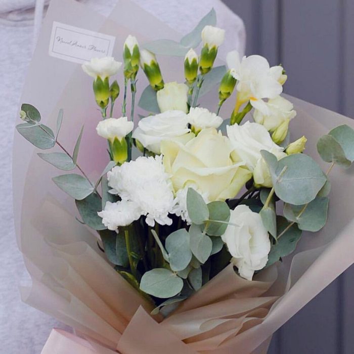 Альстромерии, Гвоздики, Кустовые розы, Лизиантусы, Розы, Хризантемы