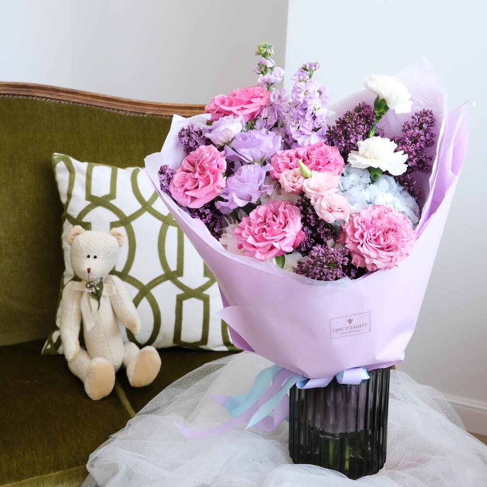 Лизиантус – 2 шт.Сирень – 5 шт.Гвоздика – 3 шт.Гортензия белая – 1 шт.Упаковка дизайнерская – 2 шт.Гортензия голубая – 1 шт.маттиола сиреневая – 2 шт.кантри блю пионовидная роза – 5 шт.