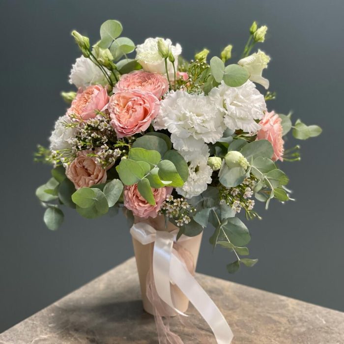 Эвкалипт – 2 шт.Лизиантус – 3 шт.Ваксфлауэр – 1 шт.Роза Джульетта – 3 шт.Коробка – 1 шт.Оазис флористический – 1 шт.
