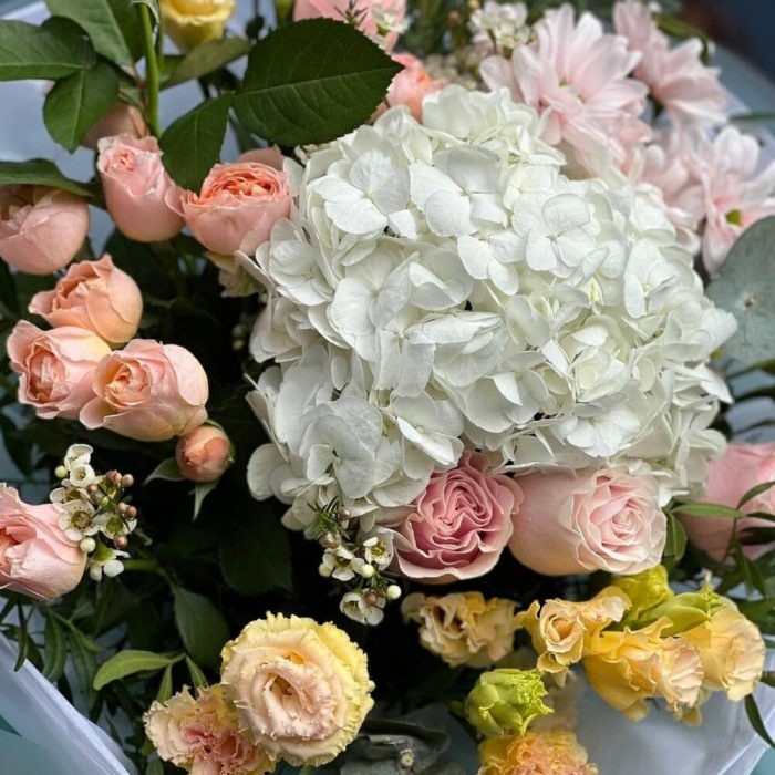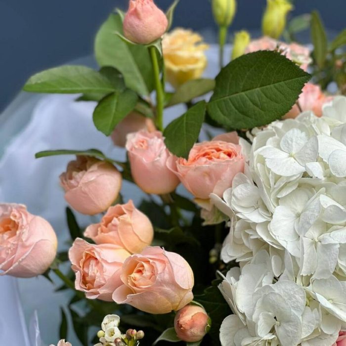 “Эвкалиптическая роскошь” гортензия и пионовидная кустовая роза