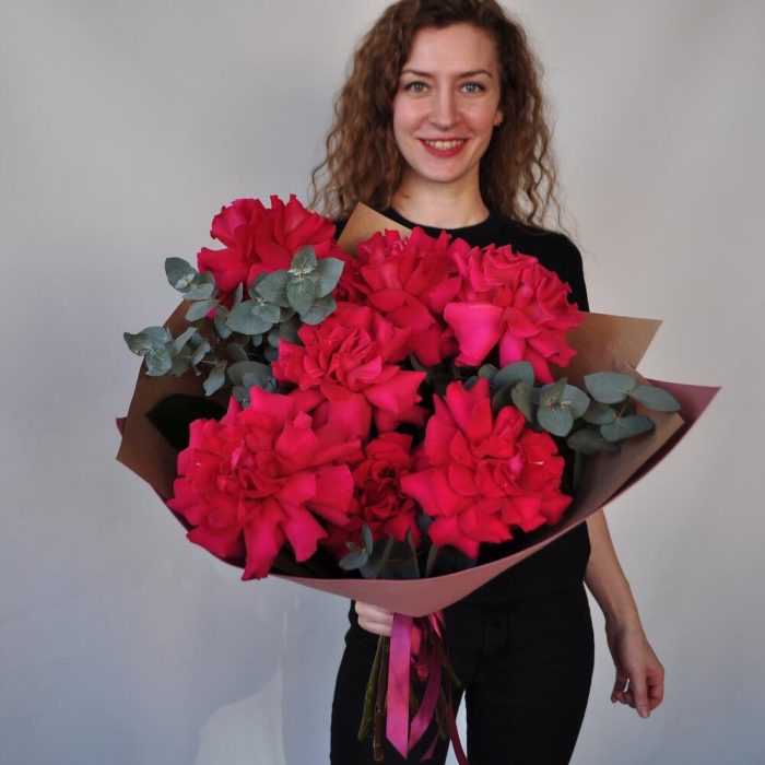 Эвкалипт – 1 шт.Лента атласная – 1 шт.Крафт – 1 шт.Роза французская пионовидная – 7 шт.Фоамиран (упаковка) – 1 шт.