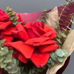 Лента атласная – 1 шт.Тишью – 1 шт.Эвкалипт Baby Blue – 3 шт.Упаковка корейская пленка – 1 шт.роза французская алая нина – 3 шт.